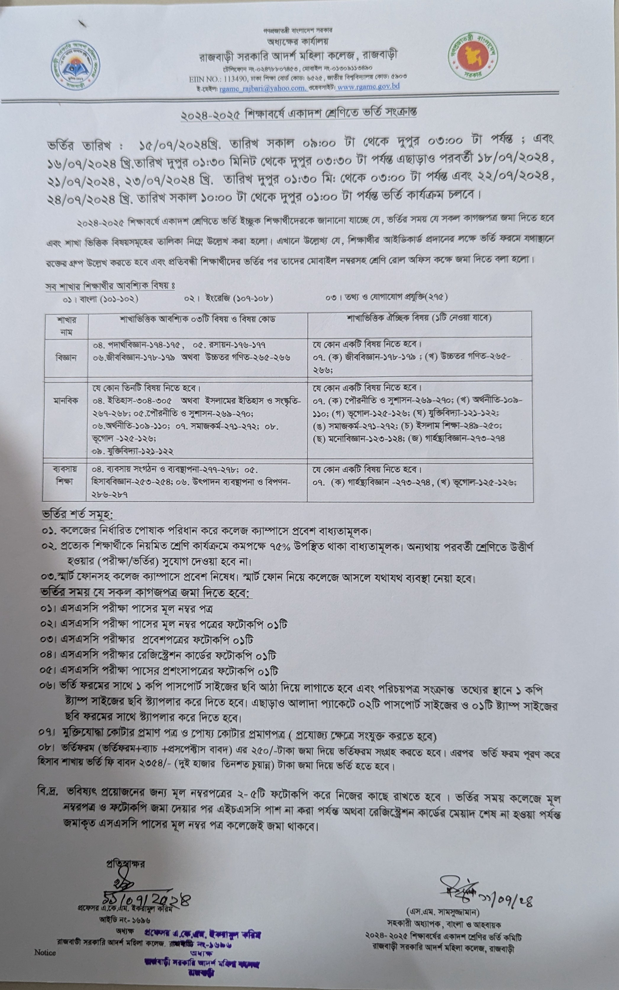 ২০২৪-২০২৫ শিক্ষাবর্ষে একাদশ শ্রেণীতে ভর্তি সংক্রান্ত